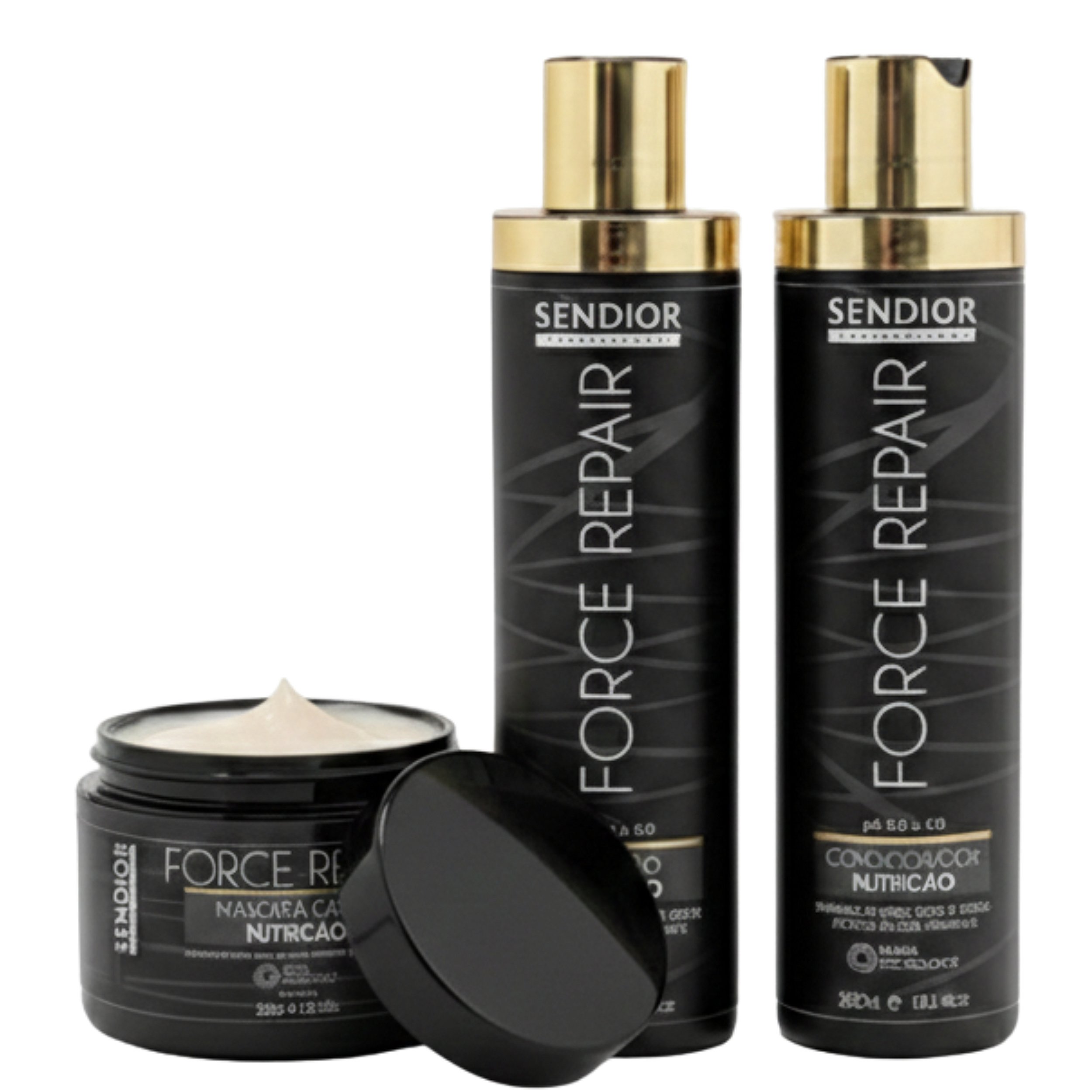Kit Nutrição Force Repair Completo Sendior oferece uma solução eficaz para cabelos danificados, promovendo nutrição profunda e recuperação dos fios. Inclui shampoo, condicionador e máscara capilar, formulados para fortalecer cabelos fragilizados e devolver brilho saudável. Ideal para uso diário, o shampoo de 300ml limpa suavemente enquanto nutre, o condicionador de 300ml desembaraça e hidrata, e a máscara capilar de 300g proporciona reparação intensiva. Produto com pH adequado para preservar a saúde dos fios, enriquecido com ingredientes que reforçam a estrutura capilar e auxiliam na renovação do cabelo. Uma escolha técnica para quem busca resultado profissional em casa, com tratamento completo para cabelos opacos e sem vida.